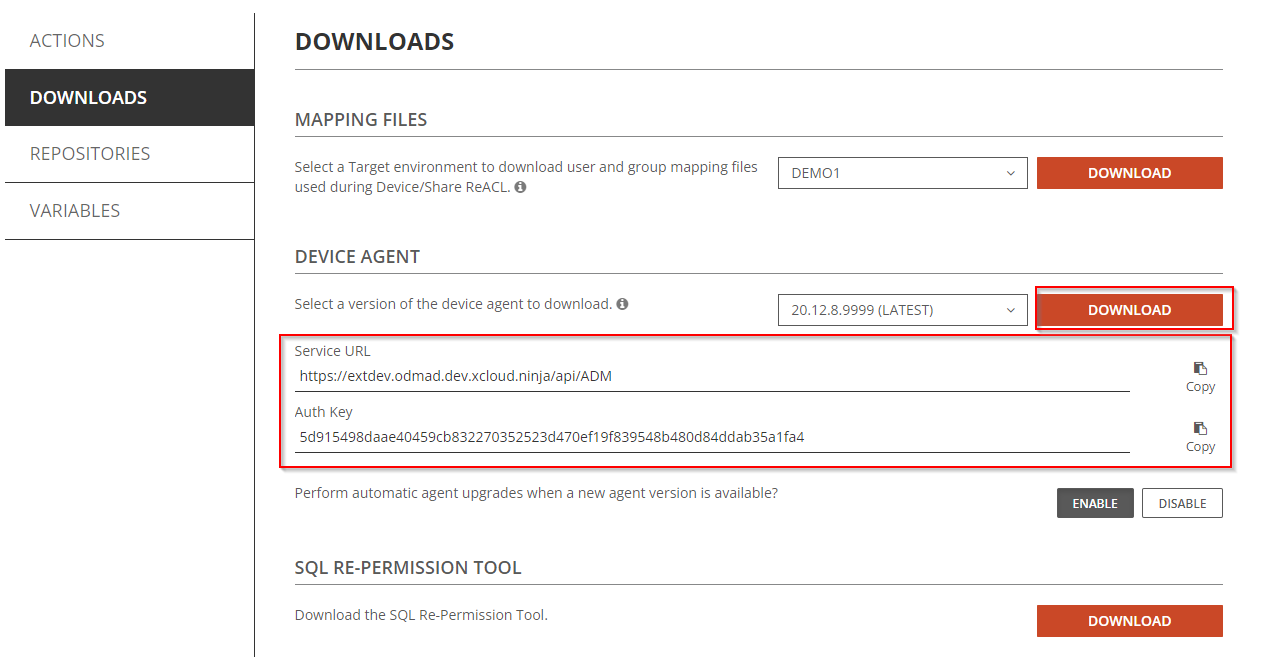 4. Download the latest device agent and note the Service URL and Auth Key for later use.