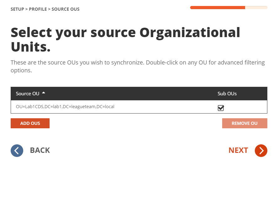 - Configure any Stage Data filter you like by double clicking the OU in the OUs list. It is highly recommended to setup the filter to limit the scope to perform a test on the first sync as part of the validation. Click Next.
