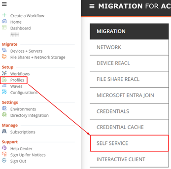 When you select Profiles from the hamburger menu in On Demand Migration for Active Directory, you will see a new section for creating Self Service profiles.