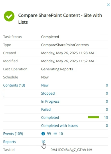 The Compare SharePoint Content task compares items in the list between source and target tenants.