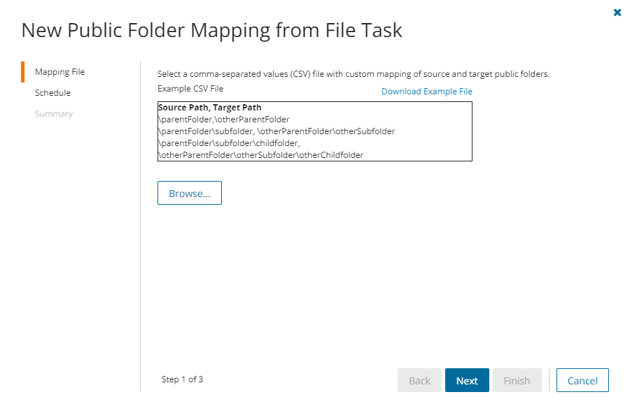 • You can download a CSV template when you start the New Public Folder Mapping from File Task wizard and click Download Example File from the Mapping File step.