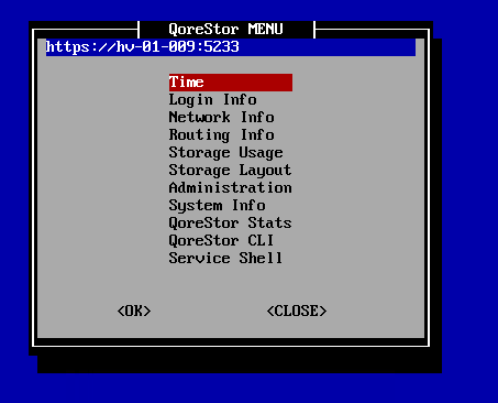 The table below details the configurations available for each menu item. The Administration , QoreStor Maintenance, and QoreStor Stats menu items provide access to additional sub-menues, and are documented separately in the topics linked to below.