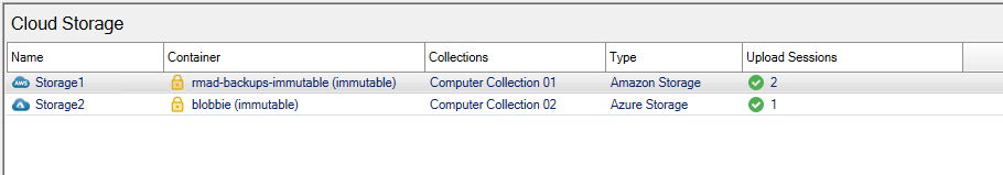All registered cloud storage will be displayed in the Cloud Storage pane. The display name, the chosen container, all configured computer collections and a summary of the upload sessions will be displayed.