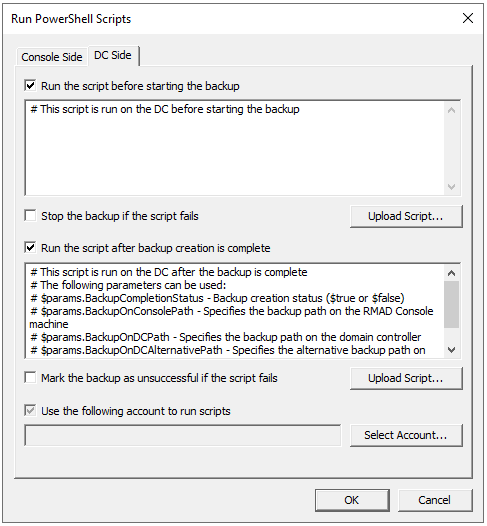 • Run Scripts This option allows you to customize your environment by running PowerShell® scripts before and/or after creating a backup. Custom scripts can be launched either on the Recovery Manager for Active Directory Console machine or on the domain controller side.