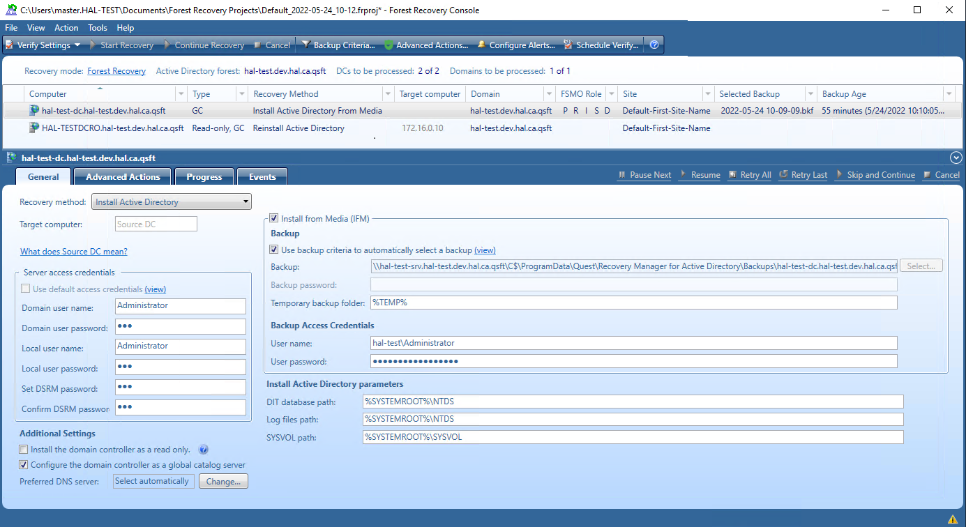 Access domain controllers in the recovery project