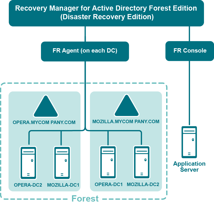 The following diagram shows the Recovery Manager for Active Directory Forest Edition (Disaster Recovery Edition) deployment: