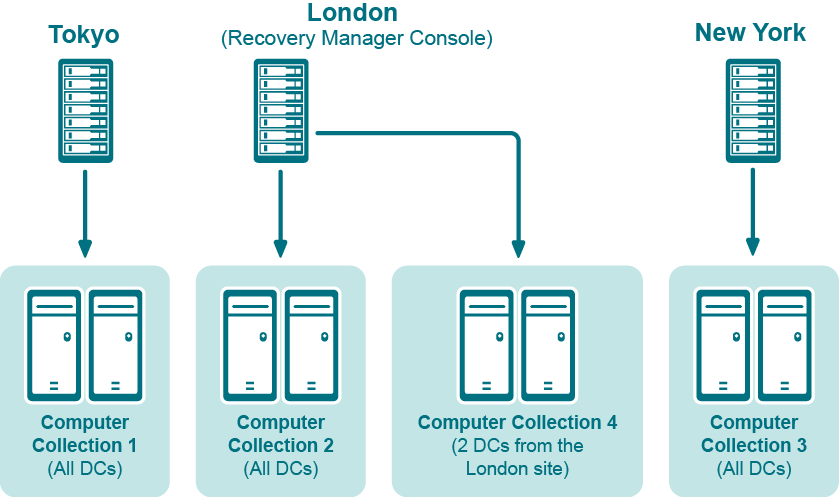 In this example, the Recovery Manager Console is installed in the London site. Computer Collections 1, 2, and 3 include all domain controllers from the Tokyo, London, and New York sites, respectively. Computer Collection 4 includes two domain controllers from the London site. Backups of these two domain controllers are accessible to the Recovery Manager Console via a fast link and can be used to perform selective online restores of Active Directory® objects.