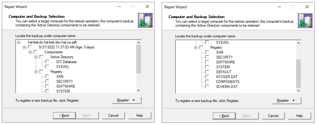 The Repair Wizard helps you restore the Active Directory® components on a domain controller, including the Active Directory® database, SYSVOL and registry. With this wizard you can select a Active Directory® backup, select Active Directory® objects for authoritative restore, and perform a primary restore of SYSVOL including registry hives.
