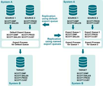 • You can combine named export queues with default export queues. Tables in the configuration with a standard routing map (targetsys@database_spec without a named queue specification) are replicated through a default export queue.