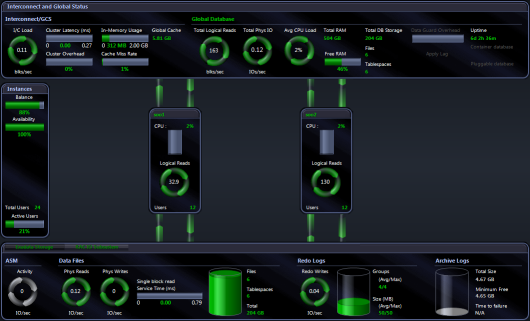 The display is based on the Oracle RAC architecture diagram. Oracle RAC Architecture Overview