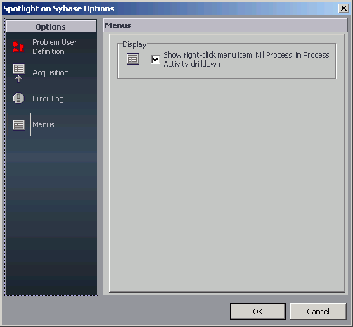 You can include or exclude the Kill Process option which is on the right-click menu of the User Activity pane. The Kill Process function allows you to kill any process on the ASE server if your User ID has the authority to do so.