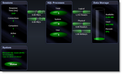 The Spotlight on SQL Azure home page provides a quick and intuitive view of the activity of a SQL Azure database.