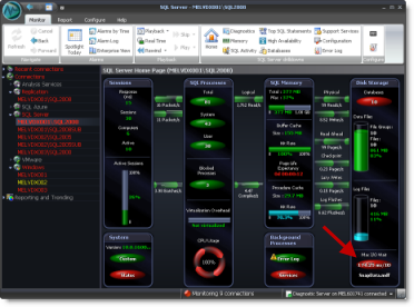 Sustained high I/O wait time rates are a good indicator that of a disk subsystem bottleneck and that I/O device service times will be degraded. When Spotlight detects unusually high disk activity on the SQL Server machine it raises an alarm.
