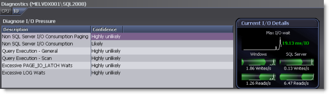 The first grid on the I/O page shows the possible causes of high I/O and the likelihood of each contributing to this instance of the alarm. Click an item in the grid to display an explanation of the diagnosis and supporting information.