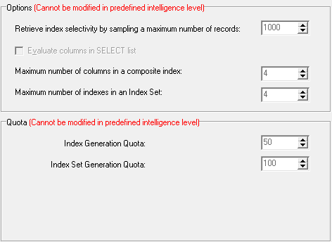 Set a specific optimization intelligence level here. Values on the Index Options page adjust to this level. Levels range from 0 to 10. The higher the setting, the higher the number of Index sets generated.