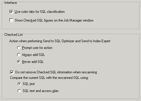 When checked, an additional column of numbers is added to the SQL classification columns to indicate how many SQL statements have been checked for each Job. When a SQL statement is added to the Checked SQL list, it has a value in the appropriate SQL classification column in the Job Manager window.