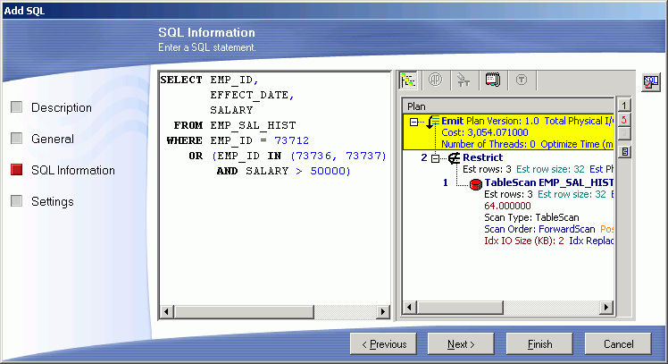 The SQL Information page of the Add SQL wizard is where to enter the SQL text and view various information about the SQL statement, such as the query and abstract plans.