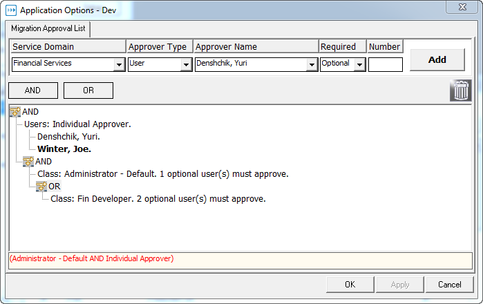 It is recommended that before setting up a migration approval list, you have a basic idea of what approver groups (users and user classes) you want involved in the approval process as well as the relationships between these groups, which you define using AND and OR operators. For example, if the approval of one or more approver groups are required, you would begin the approval list with the AND operator. If, however, the approval of only one of two or more approver groups are required, you would begin the list with the OR operator.