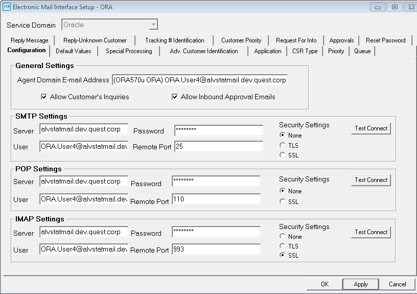 The encryption protocol, if any, used for inbound and outbound communications with the server. Options include TLS (for SMTP and IMAP), SSL, and None (for no encryption). NOTE: When you switch from None to SSL or TLS, the port numbers are automatically changed to the corresponding industry standard. These numbers include: