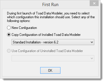 - Once you launch the installed version of Toad Data Modeler, the First Run dialog appears. Select a configuration from previous installations or create a new one.