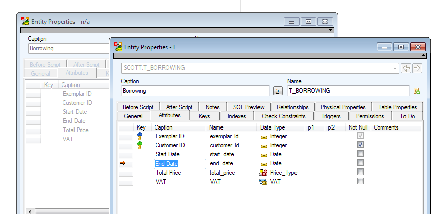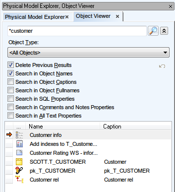 Toad Data Modeler allows you to display a complete list of selected objects of your model, e.g. attributes, triggers, check constraints, views, etc. with a possibility to open the Properties dialog of the selected object(s), delete them or find on the Workspace.
