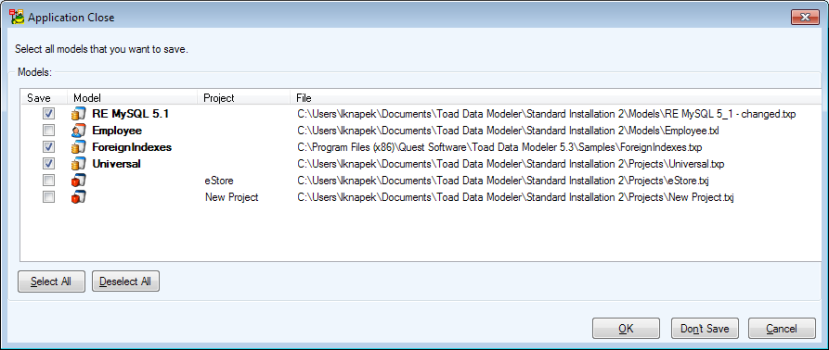 Finishes your work in Toad Data Modeler. Before closing the application your are asked to save changes you made in your models.