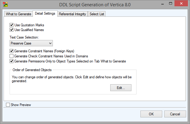 • Options are available in Options | Model | Physical Model | Vertica | Vertica 8.0
