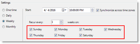 In the weeks on field, select each and every day of the week. This ensures that the task runs each day of the week, including Saturday and Sunday.