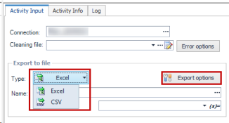 • In the Connection group, select either Microsoft Excel or CSV file, depending on your export format