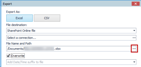 Note: When exporting data to an Excel or CSV file stored on SharePoint Online Server, the file path will be greyed out as a distinct difference between locally stored files.