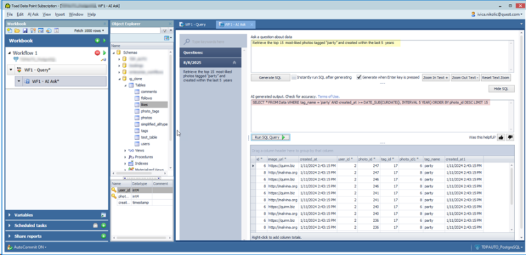 AI Ask is available to users with a Toad Data Point Pro AI Subscription license. This feature streamlines data querying within Toad Workbook by allowing users to submit questions in natural language, automatically generating the corresponding SQL and displaying the results.