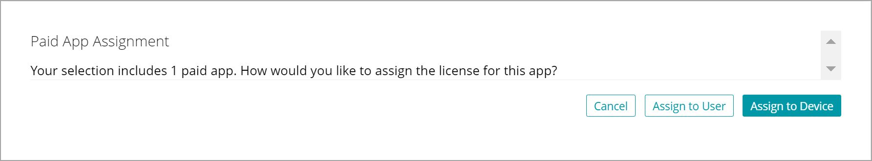 When you attempt to install a paid VPP app to a device, a message appears, requesting you to either Assign to User or Assign to Device.