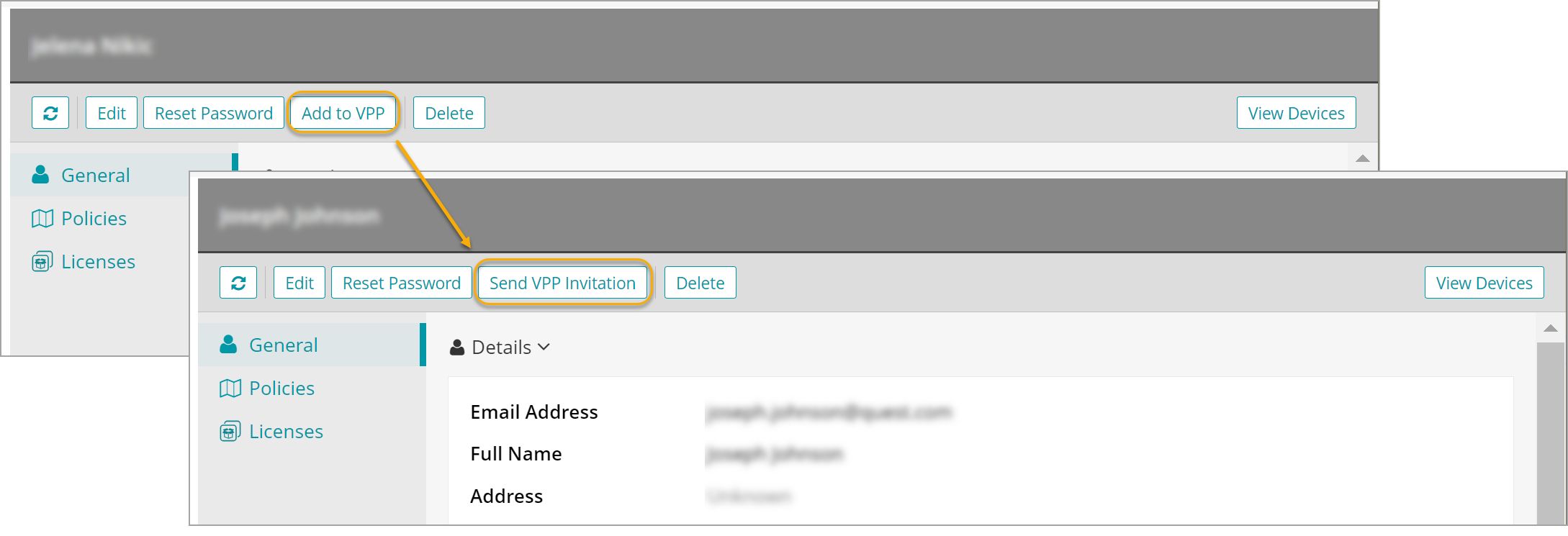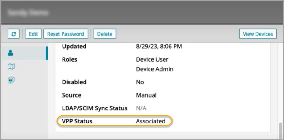 An email is sent to the user, and notifications appear on the associated iOS devices. The user must then accept the EULA to get the app. Once the user is successfully added to the VPP, the VPP Status field changes to Associated.