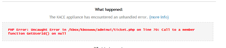 When clicking on More Info, the following error is observed: Uncaught Error in /kbox/kboxwww/adminui/ticket.php on line 70: Call to a member function GetUserId() on null.