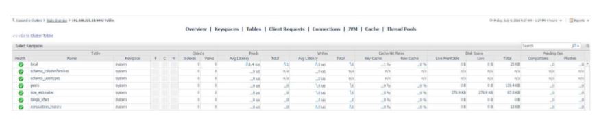 The Node Tables page lists tables on the selected node, aggregating metric information across nodes, with metric information on reads and writes, latency timing, disk space, and pending operations. Clicking the Table Name column value will drill down to the Node Table page for more information on that table. The “Go to Cluster Tables” link above the table will link to that page for the same cluster, where you can compare tables across different nodes by selecting a table row. To filter the list of tables by keyspace, click the Select Keyspaces button at the top left of the table and select one or more keyspaces for which you wish to view tables.