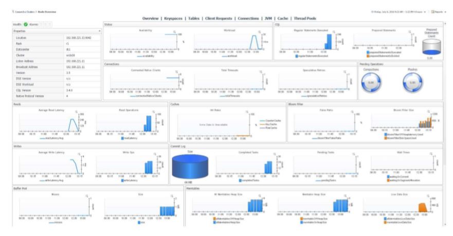 The Node Overview page provides a comprehensive view of the Cassandra Node, with health and alarms and configuration information at the top left and metrics grouped into relevant categories on the rest of the page. Once in the node section of the dashboards, the navigation bar at the top of the page can be used to navigate between different pages containing more information on the selected node. The Node Selector in the action panel on the right can also be used to switch between nodes in the same cluster.