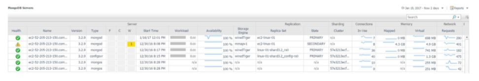 This top-level dashboard lists all monitored MongoDB Servers and contains important configuration information, alarm status, and key metrics for the server. The workload metric is used for comparing the amount of work a server is doing relative to another MongoDB server. Clicking the DB server’s name will drill down into the Server Overview dashboard. If using the Infrastructure cartridge to monitor the host, clicking or hovering on the host name will provide more information on the DB server’s host.