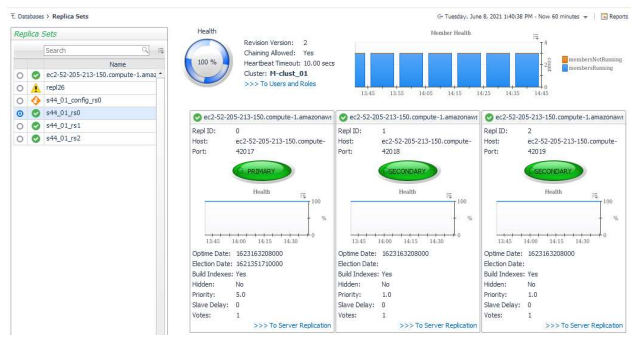 This top-level dashboard is dynamic and expands to provide a list of discovered Replica Sets. Selecting a specific Replica Set from the left-hand navigation pane automatically updates the right side of the page showing all members of the Replica Set. The Health indicator shows percentage of members currently running. The adjacent bar graph shows number of members running/not running. If the server is actively monitored by a MongoDB Agent, a link “Click for More Information” will appear, leading to the Replication page for that server, covered later in this document.