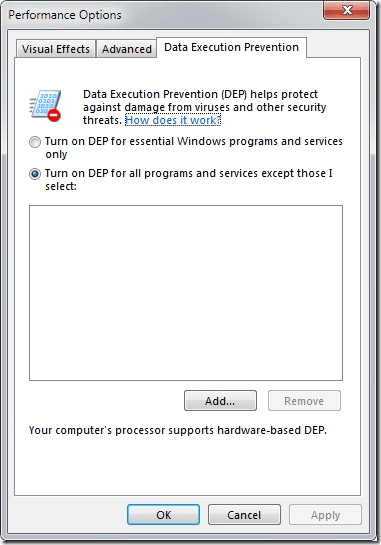 This behavior occurs because Microsoft uses the Data Execution Prevention (DEP) feature to help prevent damage from viruses and from other security threats.