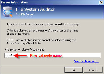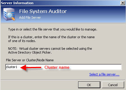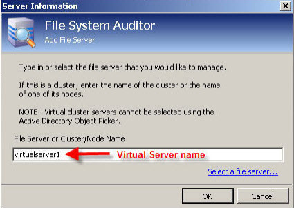 File System Auditor audits events based on the physical node names of the cluster server, not virtual server names. The FSA Agents must be distributed to each physical node in the cluster; therefore there is no reason to add the virtual server name into the Agent Configuration Console.