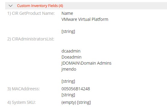 The Custom Inventory Rule is created and in next inventory update the Custom Inventory Field will be available in the Inventoried Device, in this example, it is number 2, CIRAdministratorsList.