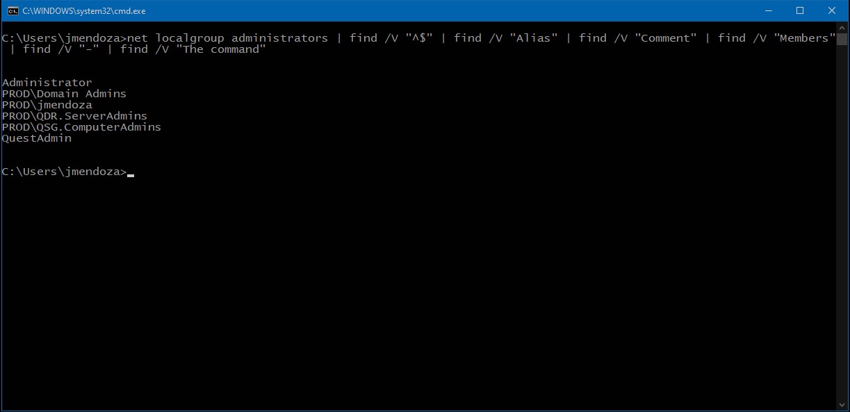 net localgroup administrators | find /V "^$" | find /V "Alias" | find /V "Comment" | find /V "Members" | find /V "-" | find /V "The command"