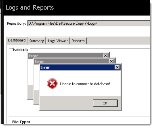 When selecting Secure Copy | Logs and Reports, and error occurs: Error; "Unable to connect to database!"