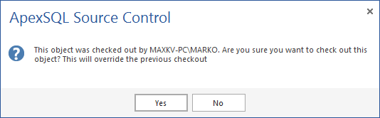 Even with the visual clues, developers can still attempt to check out previously checked out objects. A developer will be informed that the object is checked out already, by someone else, but it could be checked out again by clicking the Yes button in the following dialog:
