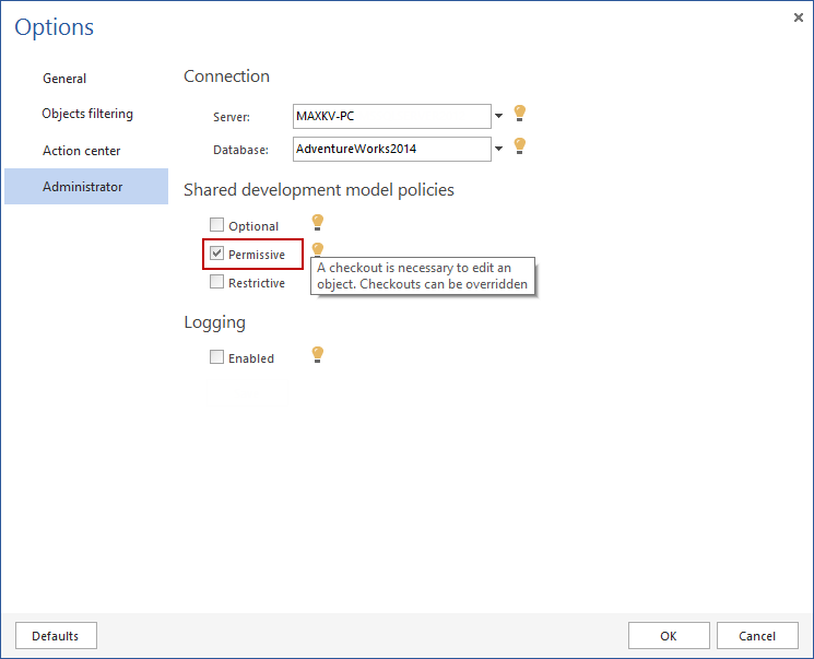 ApexSQL Source Control provides a Permissive policy, to set the database development for the source control shared database in a way that each object must be checked out before edit. When the object is checked out, the rest of the team will also be aware that someone is working on an object, and additionally be prevented from checking out the object at all: