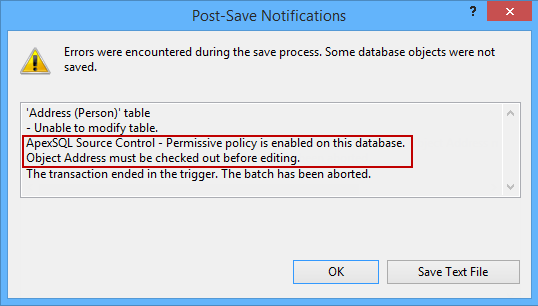 This will ensure that each object needs to be checked out first, so if a developer tries to edit any object, a SQL Server Management Studio warning appears, with an informative message that an object needs to be checked out before editing: