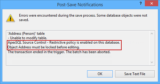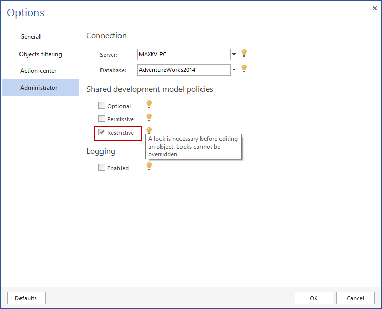 ApexSQL Source Control offers a Restrictive policy option, to set the source control shared database development in a way to require a lock on an object before editing. When the object is locked, the rest of the team will not be able to work on the same object until either an object is unlocked by a developer who locked it:
