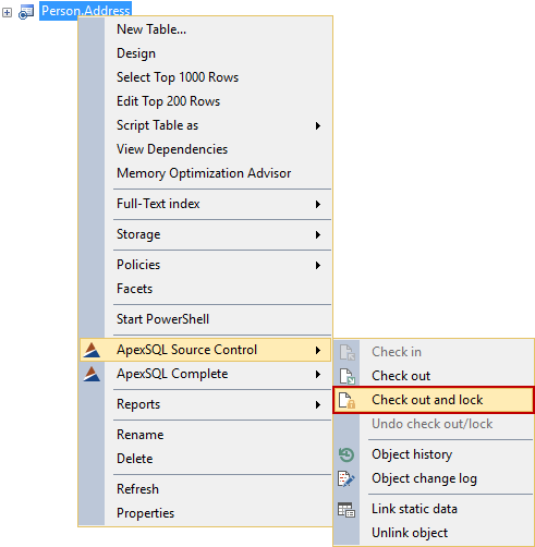 To lock the object, right click on it in the Object Explorer pane, and select the Check out and lock option from the ApexSQL Source Control context menu: