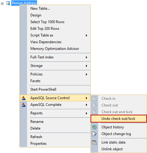 Unlike the Check out option, where each developer can check out an object, no matter if it is already checked out by someone else, the Check out and Lock option will not allow that. The developer who locks an object is the only one who can “unlock” it, by applying changes to source control repository (if it is modified), or by applying the Undo Check out/lock option from the ApexSQL Source Control menu in Object Explorer pane: