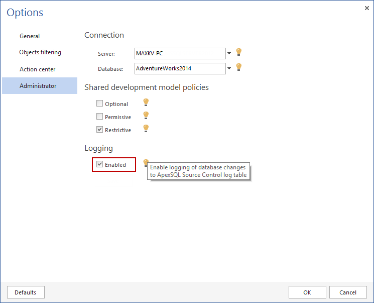 ApexSQL Source Control provides a Logging feature to enable logging for changes made in the source control shared database development: